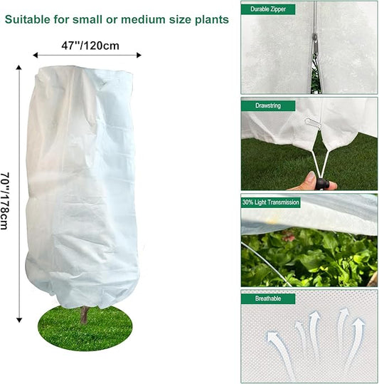 2 Packs Plant Covers Freeze Protection, 47"W X 70"H Large Frost Blankets 2.47oz/yd² with Zipper Drawstring, Reusable Frost Cloth Winter Tree Covers Shrub Jackets for Outdoor Plants Fruit Tree Potted