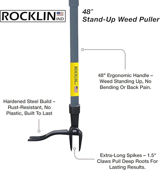 Rocklin™ Stand Up Weed Puller Tool - 4 Claw Steel Head - 48 inch Handle - 100% Metal - Easily Remove Weeds Without Bending or Kneeling (WeedPuller2.0)
