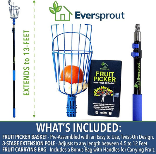EVERSPROUT 4.5-to-12ft Durable Fruit Picker with 20+ Foot Reach – Telescoping Fruit Picker Pole, Lightweight Twist-On Fruit Picking Tool with Basket, Aluminium Extension Pole for Tree Fruit Harvesting