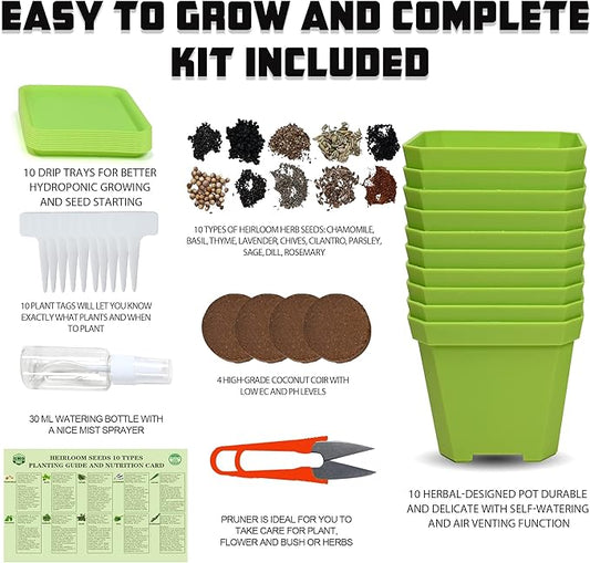 10 Herb Seeds Garden Starter Grow Kit with Green Pots, Markers, Nutritional Soil, Watering, Herb Clipper, Complete Indoor Potted Plant Growing Set for Kitchen DIY