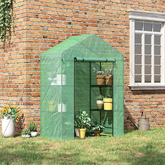 Outsunny 5' x 2.5' x 6.5' Mini Walk-in Greenhouse Kit, Portable Green House with 3 Tier Shelves, Roll-Up Door, and Weatherized PE Cover for Backyard Garden, Green