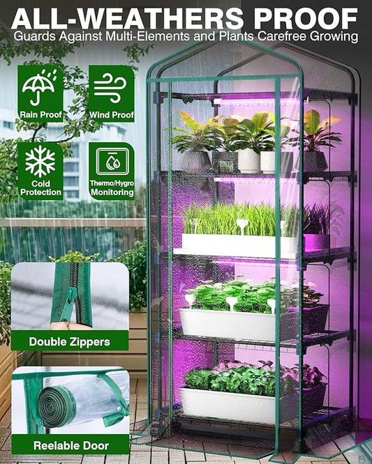 PYY Mini Indoor Greenhouse with Grow Light - Small Portable Outdoor Plant Green House Cabinet with Wheels, Thermometer, PVC Tent Cover, 4 Dimmable 3 Color 2FT 36W LED Kit, 4 Tier Gardening Shelves