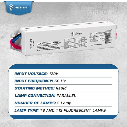OHLECTRIC Replacement for Keystone KTEB-220-1-TP-EMI 2 Lamp T12 Electronic Fluorescent Ballast | 120V Input with Instant Start Operation | 0.88 Ballast Factor, UL-Approved