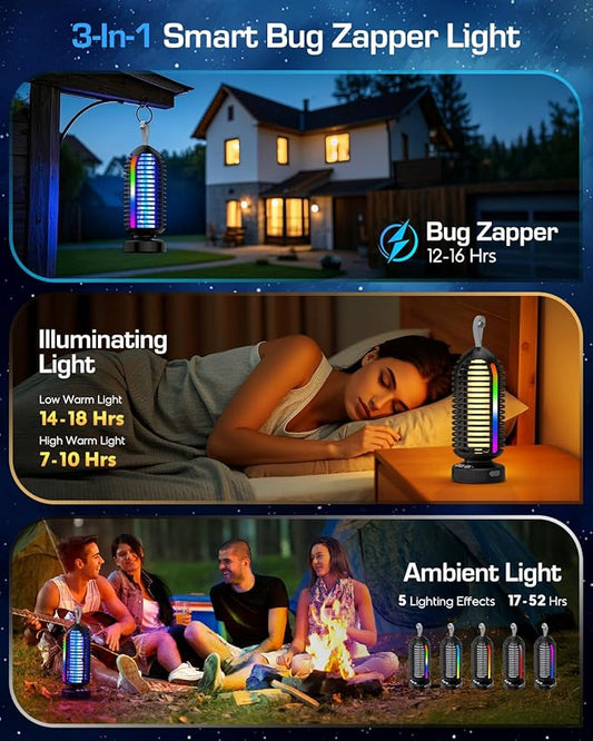 Bug Zapper Outdoor with Colorful Lighting and Auto-Sensing, 3 in 1 Cordless 4000mAh Battery Electric Fly Trap, Rechargeable Mosquito Zapper for Camping, Patios, Garden, Kitchen (1Pack-Black)