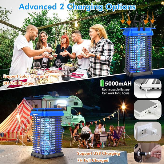 Rechargeable Solar Bug Zapper Outdoor & Indoor Blue, 5000mAh Mosquito Zapper Fruit Fly Trap, Gnat Moths Catcher, 4200V Grid, USB Charging, Fit for Home, Kitchen, Backyard, Camping, Patio