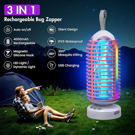 Bug Zapper Outdoor with Colorful Lighting and Auto-Sensing, 3 in 1 Cordless 4000mAh Battery Electric Fly Trap, Rechargeable Mosquito Zapper for Camping, Patios, Garden, Kitchen (1Pack-White)