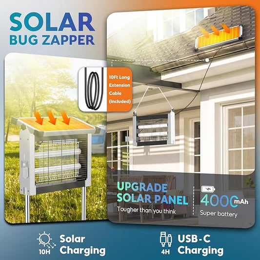 Solar Bug Zapper Outdoor Indoor, Mosquito Zapper with Dual-Mode Reading Lamp, Cordless & Rechargeable Electric Fly Trap, IPX4 Waterproof for Patio, Backyard