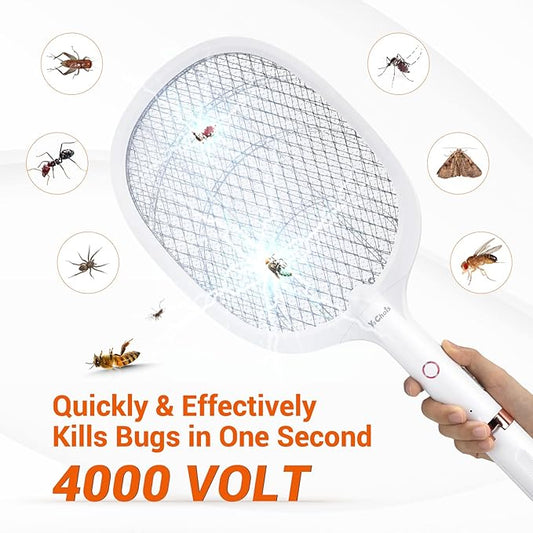 Electric Fly Swatter Racket, Rechargeable Fly Zapper - 4000 Volt, Exclusive 2-in-1 Bug Zapper Racket - USB Charging, 1800mAh Li-Battery, Indoor & Outdoor Use, White