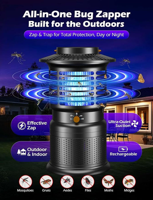 4-in-1 Mosquito Trap & Bug Zapper, Portable Rechargeable Fly Zappers with 10000mAh Battery, Bug Zapper Indoor with Silent Wind Suction, Auto On/Off Zapper Outdoor