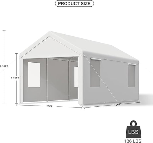 Carport, 10x20 ft White Heavy Duty Carport with Roll-up Windows, Portable Garage with Removable Sidewalls & Doors, Car Canopy and All-Season Tarp for Car Boat Truck Motorcycle