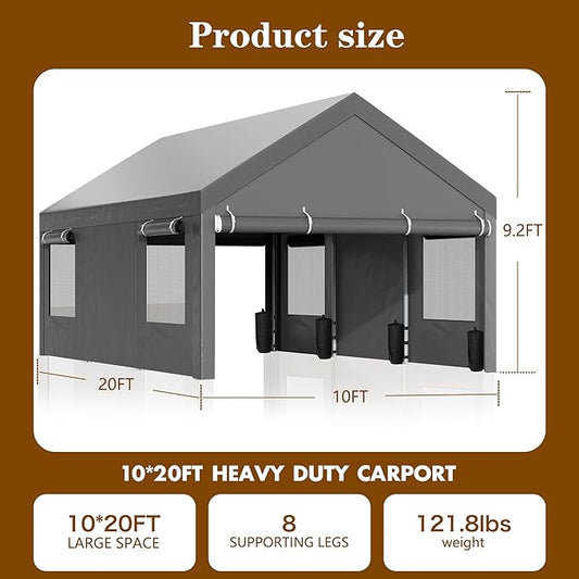 Walsunny Carport, 10x20 ft Heavy Duty Carport Canopy with Roll-up Windows, Portable Garage with Removable Sidewalls & Doors, Car Canopy with All-Season Tarp for Car, Truck, Boat