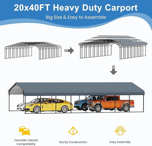 YOLENY Carport 20x40 FT, Heavy Duty Carport for Garage, Car Shelter with Galvanized Metal Roof and Frame, Easy to Install Outdoor Car Canopy, Expanding Garage Space for Pickup, 2 Cars, Gray