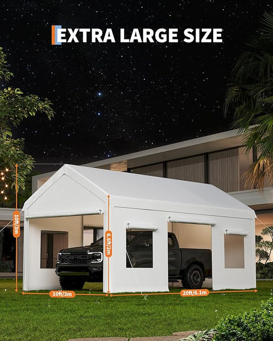 Garvee 10x20 Carport Canopy, Heavy Duty Car Port with Waterproof Tarp, Roll-Up Windows & Doors, Outdoor Portable Garage with Removable Sidewalls, for Car, Boat, Truck, Motorcycle, White
