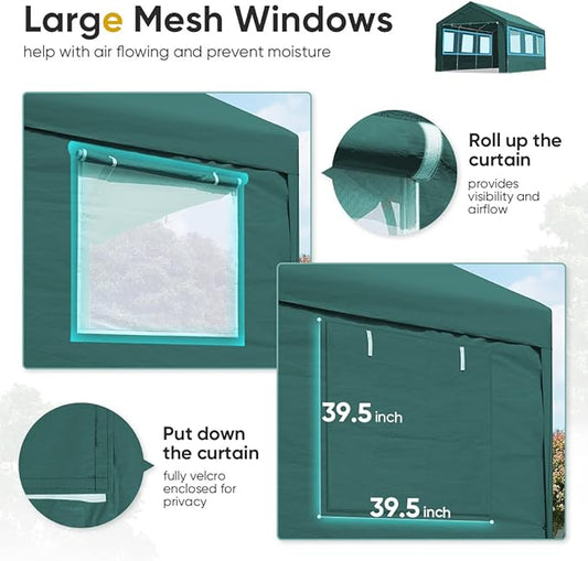 ADVANCE OUTDOOR 12x20 ft Car Canopy Garage Heavy Duty Carport Boat Shelter Party Tent, Adjustable Peak Height from 9.5ft to 11ft, with Removable Window Sidewalls and Doors, Green