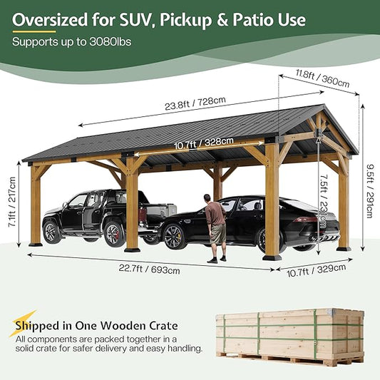 Jocisland 12x24x9.5 FT Cedar Wood Hardtop Carport with Steel Roof, Waterproof Outdoor Gazebo Pavilion, Heavy-Duty Snow & Wind Resistant Canopy for Patio, Driveway, Garden