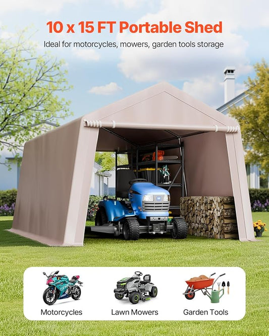 VEVOR Outdoor Storage Shed, 10 x 15 ft Portable Storage Tent with Roll-up Door & Vents, Waterproof Canopy Shed Shelter, Heavy Duty Frame, Patio Garage Carport for Motorcycle, Lawn Mower, Bike, Beige