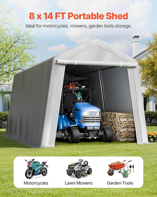 VEVOR Outdoor Storage Shed, 8 x 14 ft Portable Storage Tent with Roll-up Door & Vents, Waterproof Canopy Shed Shelter, Heavy Duty Frame, Patio Garage Carport for Motorcycle, Lawn Mower, Bike, Grey