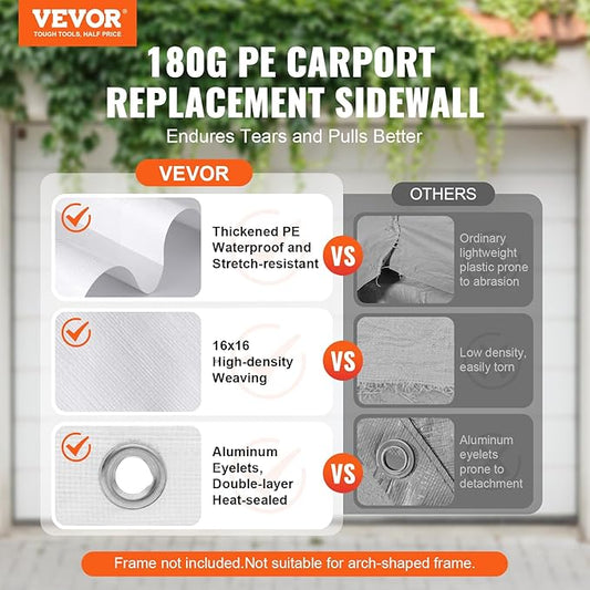 VEVOR Carport Replacement Canopy Cover Side Wall 10 x 20 ft, Garage Tent Shelter Tarp Heavy-Duty Waterproof & UV Protected, Easy Installation with Ball Bungees,White (Top and Frame Not Included)