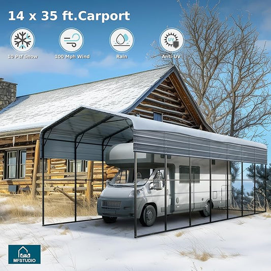MFSTUDIO RV Carport 14x35 ft, Outdoor Heavy Duty Carports, Height 13 ft for Large RVs Metal Shed Canopy Shelters Garage Shelter Shade Car Ports with Galvanized Roof for 2 Cars, Truck and Boats