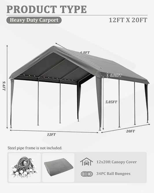 Carport Canopy Replacement Cover 12x20 Heavy Duty Outdoor Portable Car Canopy Oxford Waterproof UV & Tear Resistant Garage Canopy with Ball Bungees (Frame is Not Included)