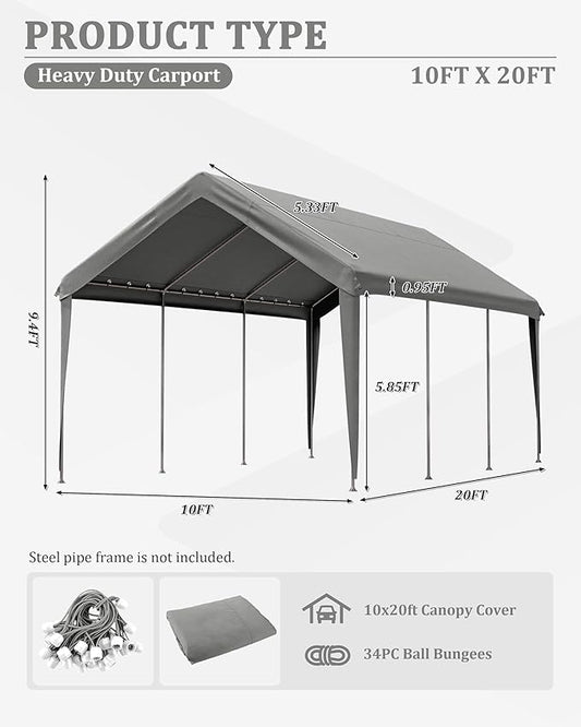 Rutile 10'x20' Carport Canopy ONLY Tent Garage Replacement Top Tarp Car Shelter Cover w/Ball Bungees Beige (Only Top Cover, Frame is not Included)