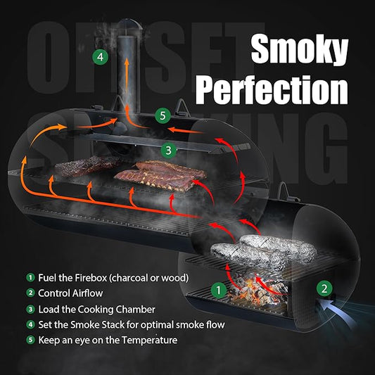 Brand-Man Charcoal Grill Offset Smoker, Heavy-Duty Barrel BBQ Grill Smoker Combo with Side Fire Box for Outdoor Patio and Backyard Cooking