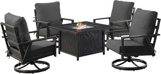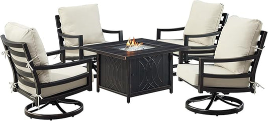 Oakland Living Black Aluminum Patio Fire Table Set with Four Club Chairs with Light Grey Cushions