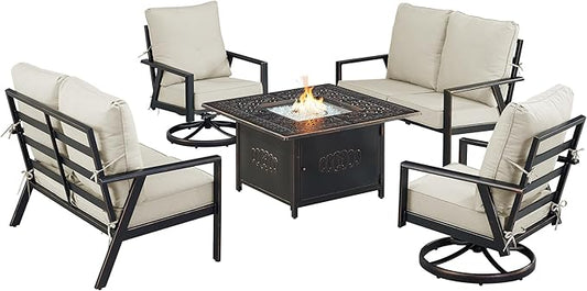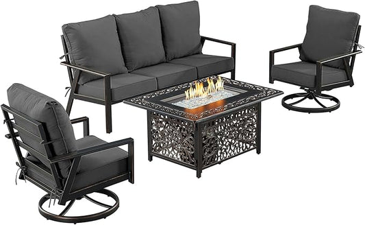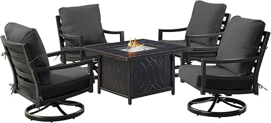 Oakland Living Black Aluminum Patio Fire Table Set with Two Deep Seating Loveseat with Cushions and Two Club Chairs with Light Grey Cushions