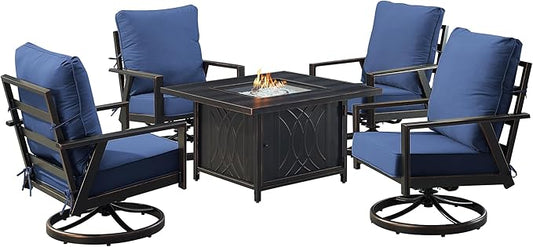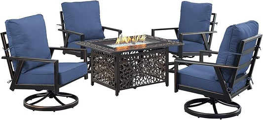 Oakland Living Black Aluminum Patio Fire Table Set with Four Club Chairs with Blue Cushions