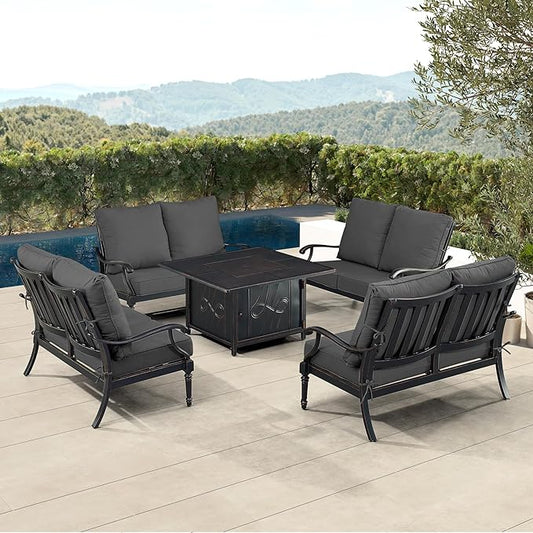 Oakland Living Black Aluminum Patio Fire Table Set with Four Deep Seating Loveseat with Cushions with Black Cushions