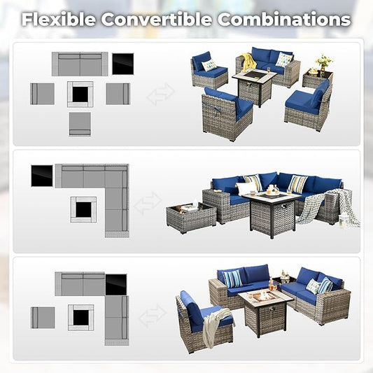 ovios 7 Pieces Patio Furniture Set, Outdoor Wicker Sectional Sofa with 30 Inch Fire Pit Table Comfy Cushions, Modern Modular Deep Seat Rattan Couch Conversation Set, Navy Blue