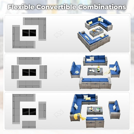 ovios 12 Pieces Patio Furniture Set, Outdoor Wicker Sectional Sofa with Glass Table Comfy Cushions, Modern Modular Deep Seat Couch Rattan Conversation Set, Navy Blue