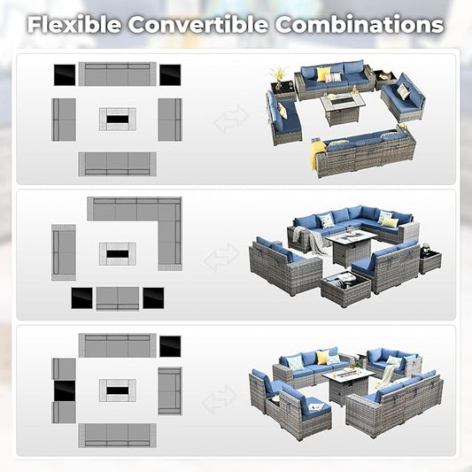 ovios 13 Pieces Patio Furniture Set, Outdoor Wicker Sectional Sofa with 42 Inch Fire Pit Table Comfy Cushions, Modern Modular Deep Seat Rattan Couch Conversation Set, Denim Blue