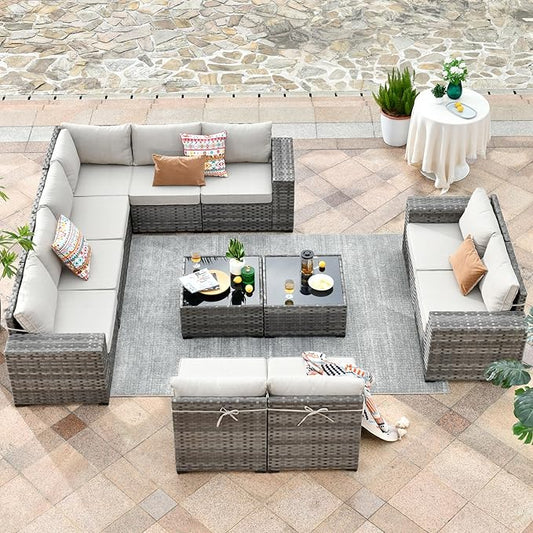 HOOOWOOO 12 Piece Modular Patio Outdoor Sectional Furniture Sofa Set,Wicker Conversation Set,Out Door Couch Set with Wide Arm for Outside All Weather(Beige)