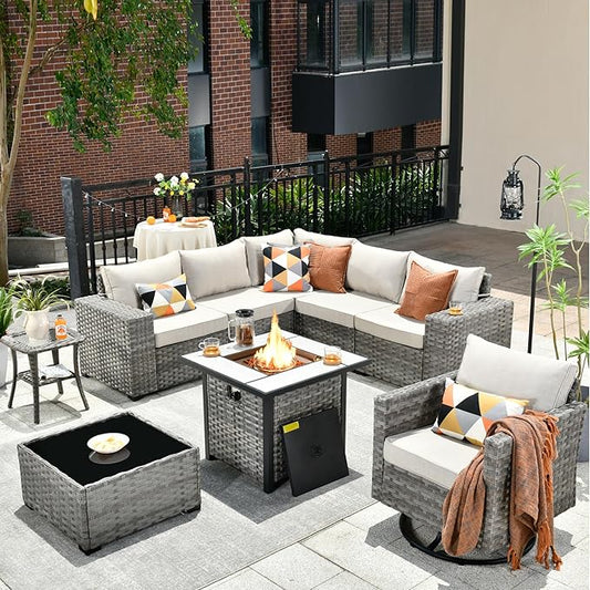 HOOOWOOO 9 Piece Modular Patio Outdoor Sectional Furniture Set with Large Propane Fire Pit Table,Wicker Conversation Sofa Set with Swivel Chairs,Outside Couch Set(Grey Stripes)