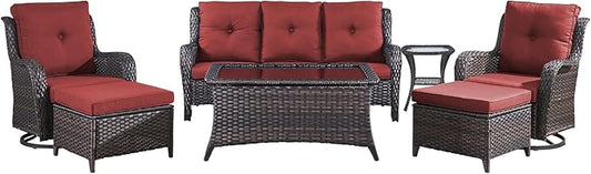 Wicker Rattan Patio Furniture Set - 7 Pieces Outdoor Couch with Swivel Chairs, Ottomans and Coffee Table for Deck, Poolside, Backyard - Brown/Red