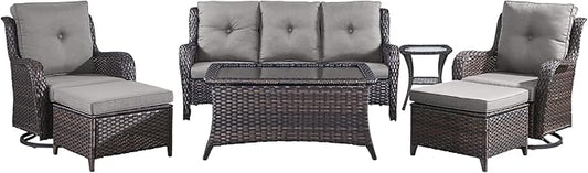 Wicker Rattan Patio Furniture Set - 7 Pieces Outdoor Couch with Swivel Chairs, Ottomans and Coffee Table for Deck, Poolside, Backyard - Brown/Grey