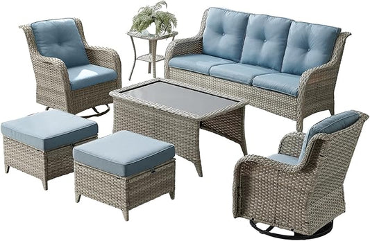 Wicker Rattan Patio Furniture Set - 7 Pieces Outdoor Couch with Swivel Chairs, Ottomans and Coffee Table for Deck, Poolside, Backyard - Light Grey/Light Blue
