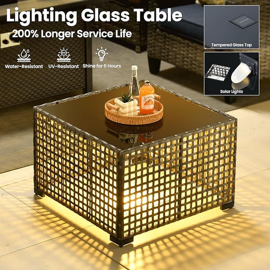 ovios 4 Pieces Patio Furniture Set Outdoor Sofa Couch with Solar Lights Table Comfy Cushions, Modern Deep Seat Wicker Rattan Conversation Set for Porch Deck, Beige