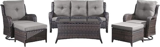 Wicker Outdoor Conversation Set-6 Pieces Outdoor Wicker High Back Couch with Swivel Rocker Chairs Patio Furniture for Deck Poolside Backyard-Brown/Grey