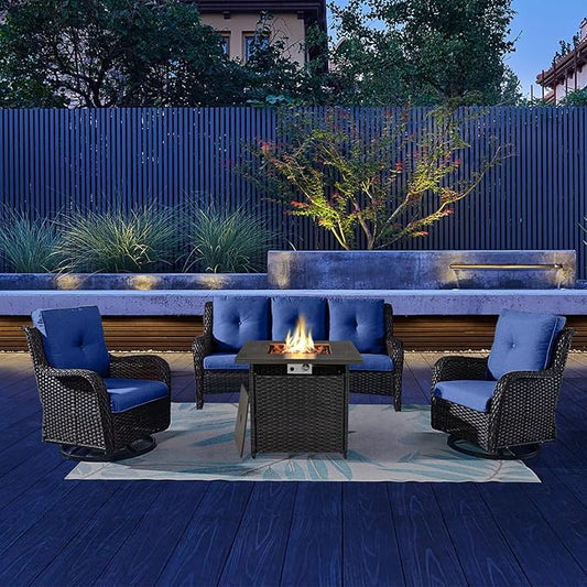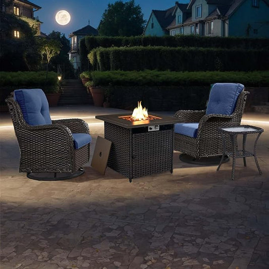 4PCS Modern Blue Patio Set with Swivel Rocking Chairs, Fire Pit Table & Thick Cushions
