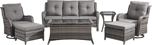 Wicker Rattan Patio Furniture Set - 7 Pieces Outdoor Couch with Swivel Chairs, Ottomans and Coffee Table for Deck, Poolside, Backyard - Grey