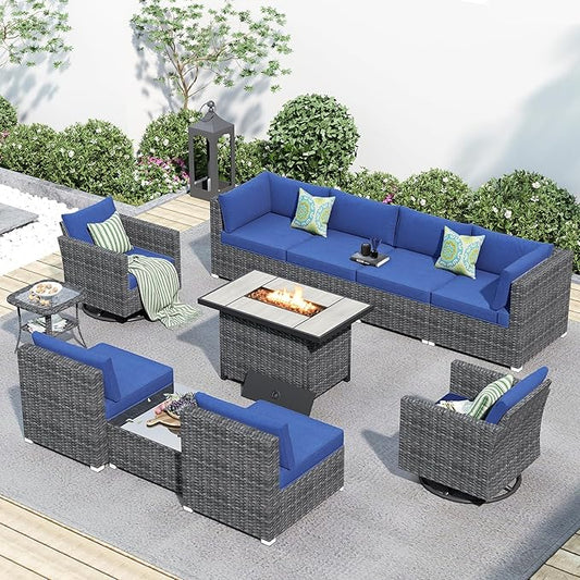HOOOWOOO 11 Piece Patio Sectional Furniture Set with Fire Pit Table,Modern Wicker Outdoor Conversation Sofa Sets,Weather Resistant Modular L Shaped Outside Couch Swivel Chair Set(Navy Blue)