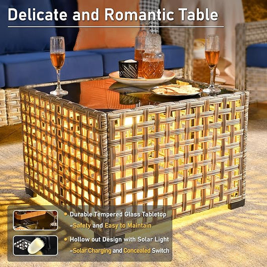 ovios 8 Pieces Patio Furniture Set, Outdoor Wicker Sofa Couch with Rocking Swivel Chairs Solar Lights Table, Modern Deep Seat Rattan Conversation Sets for Porch Deck, Denim Blue
