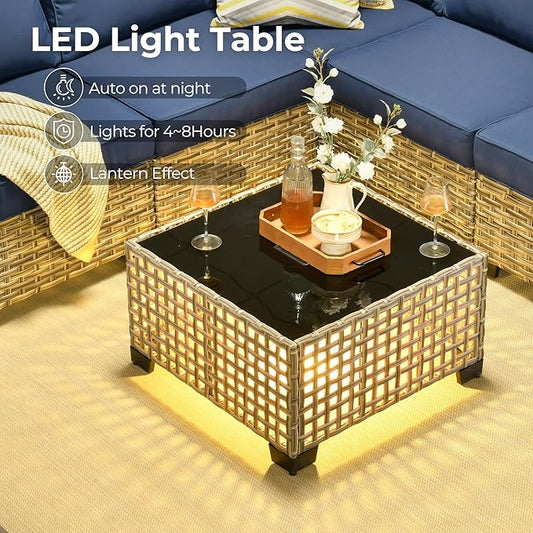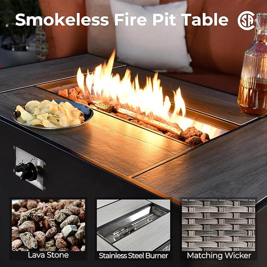 HOOOWOOO 8 Piece Patio Sectional Furniture Set with Fire Pit Table,Modern Wicker Outdoor Conversation Sofa Sets,Weather Resistant Modular L Shaped Outside Couch Set(Denime Blue)