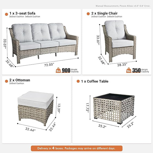 6 Pieces Patio Outdoor Furniture Set,All Weather Wicker Rattan Patio Seating Sofa and Chair Set w/Ottoman and Glowing Coffee Table,Outdoor Conversation Sets for Deck Yard Garden,Grey