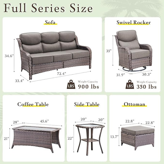 Luxury High Back Outdoor Furniture with 6-inch Extra Thick Cushions, Patio Furniture Set with Swivel Chairs, 7 PCS Wicker Conversation Set for Yard, Deck, Poolside, Brown/Grey