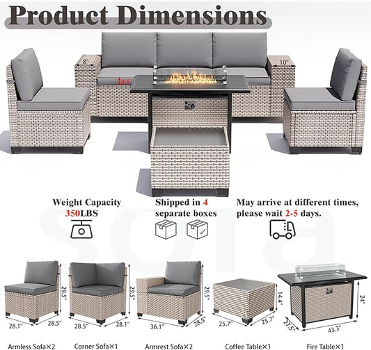 7 Pieces Patio Furniture Set with Fire Pit Table, Outdoor Sectional Wicker Sofa with Thickened Cushions and Coffee Table, High Back Rattan Patio Conversation Sets, Grey