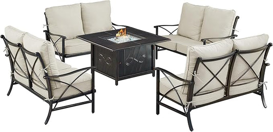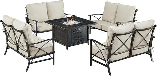 Oakland Living Black Aluminum Patio Fire Table Set with Two Deep Seating Loveseat with Cushions and Two Club Chairs with Black Cushions