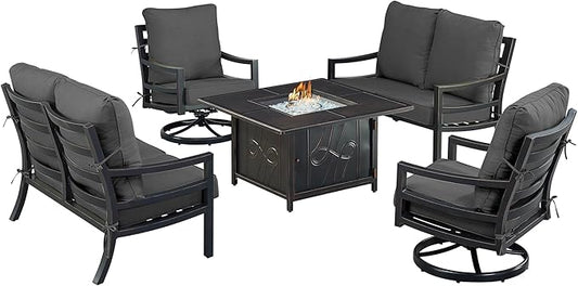 Oakland Living Black Aluminum Patio Fire Table Set with Two Deep Seating Sofa with Cushions and Two Club Chairs with Light Grey Cushions
